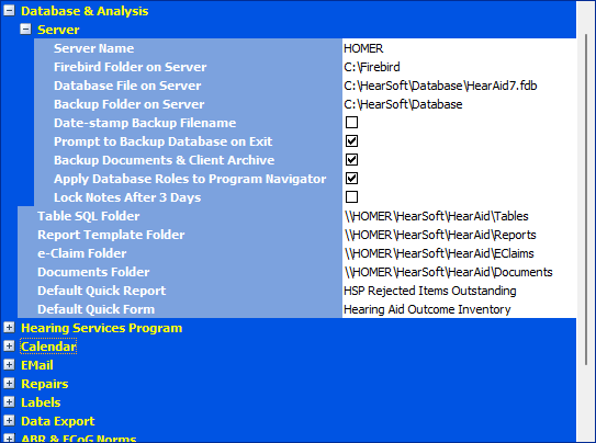 When installing HearAid on a network, the Report Template Folder, e-Claim Folder and Table SQL Folder settings must be UNC paths (for example, in the image below, where HearAid was installed on drive C: on the server with the network name "HOMER")